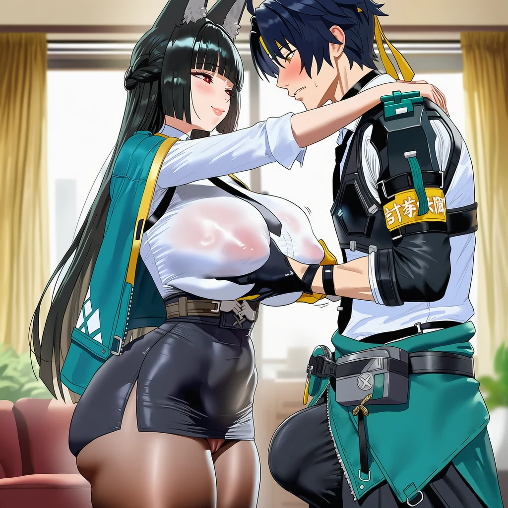 Miyabi puts on a pencil skirt for the day, which shows off her curves attracting the attention of Harumasa. She would have an easy time seducing him.